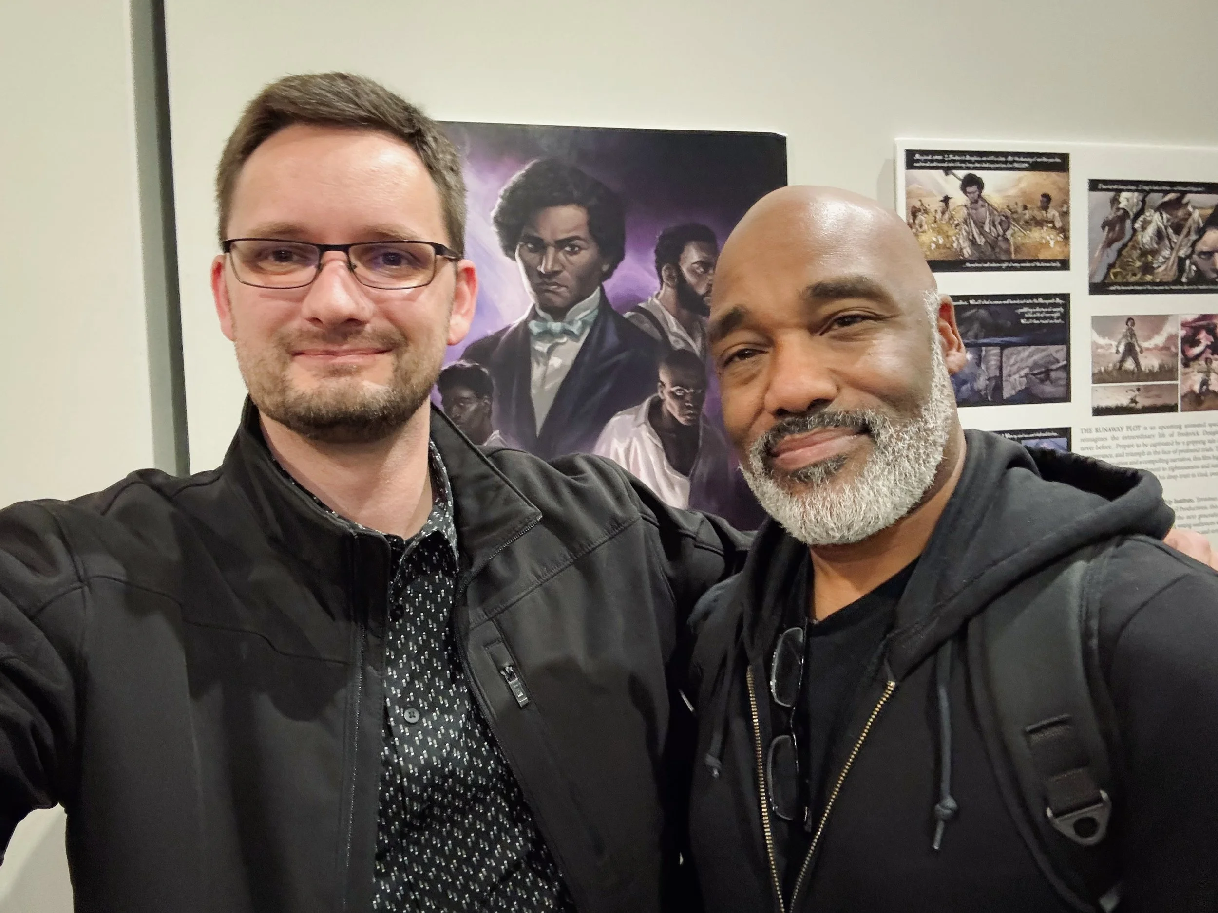 Creators, Daniel Hancock and Dr. Barron Bell, at the Liberty University art gallery exhibit featuring their comics and graphic novels, February 2025.